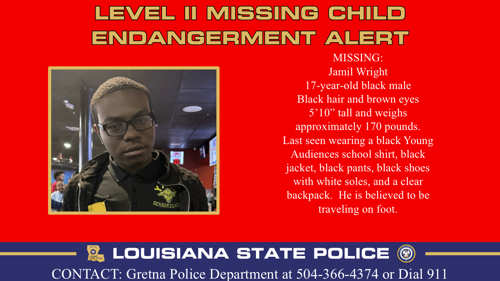 Jefferson Parish - The Louisiana State Police has issued a Level II Endangered/Missing Child Advisory on behalf of the Gretna Police Department for Jamil Wright. Wright was last seen at approximately 3:15 p.m., at school, Young Audiences, on Burmaster Street in Gretna. LSP received the request to issue an advisory at 10:02 p.m.