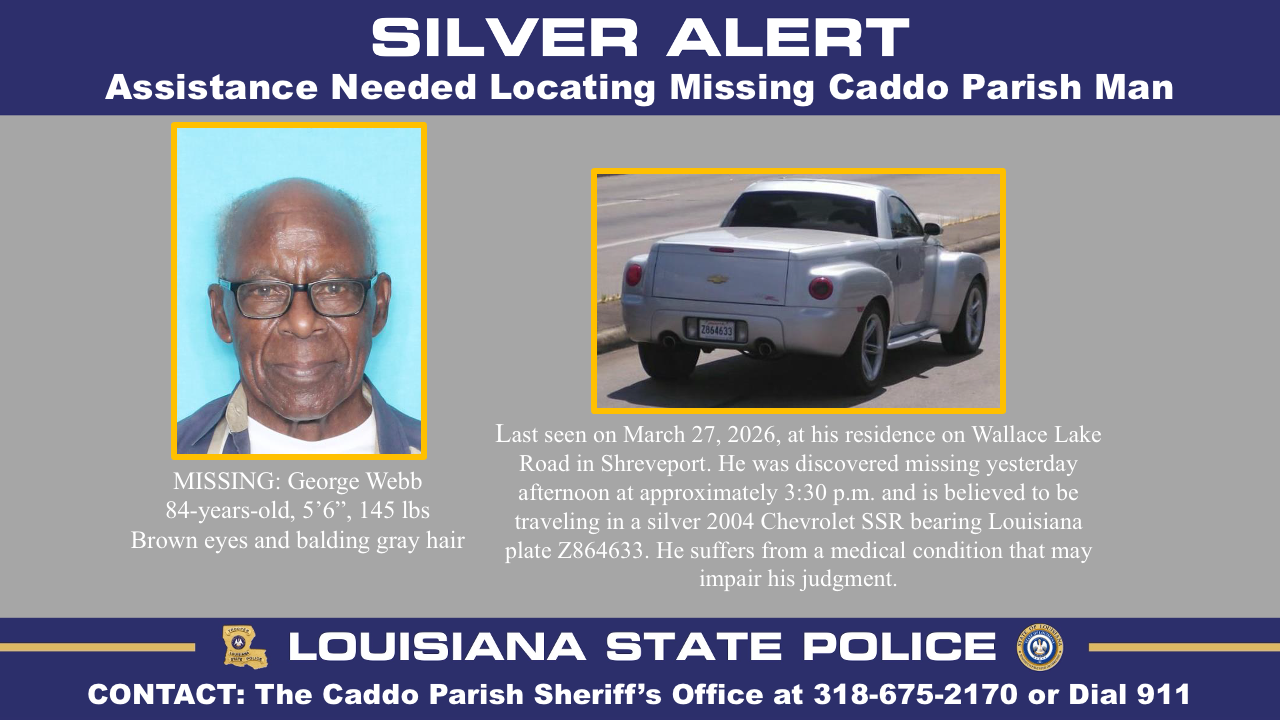 Caddo Parish – The Louisiana State Police has issued a Silver Alert on behalf of the Caddo Parish Sheriff’s Office for 84-year-old George Webb. He was last seen on March 27, 2026, at his residence on Wallace Lake Road in Shreveport. He was discovered missing on March 27, 2026, at 3:30 p.m. LSP received the request to issue an alert on March 27, 2026, at approximately 10:55 p.m.; however, through investigative leads, it was determined that he was in Texas for several hours. He is now believed to be in Louisiana.
