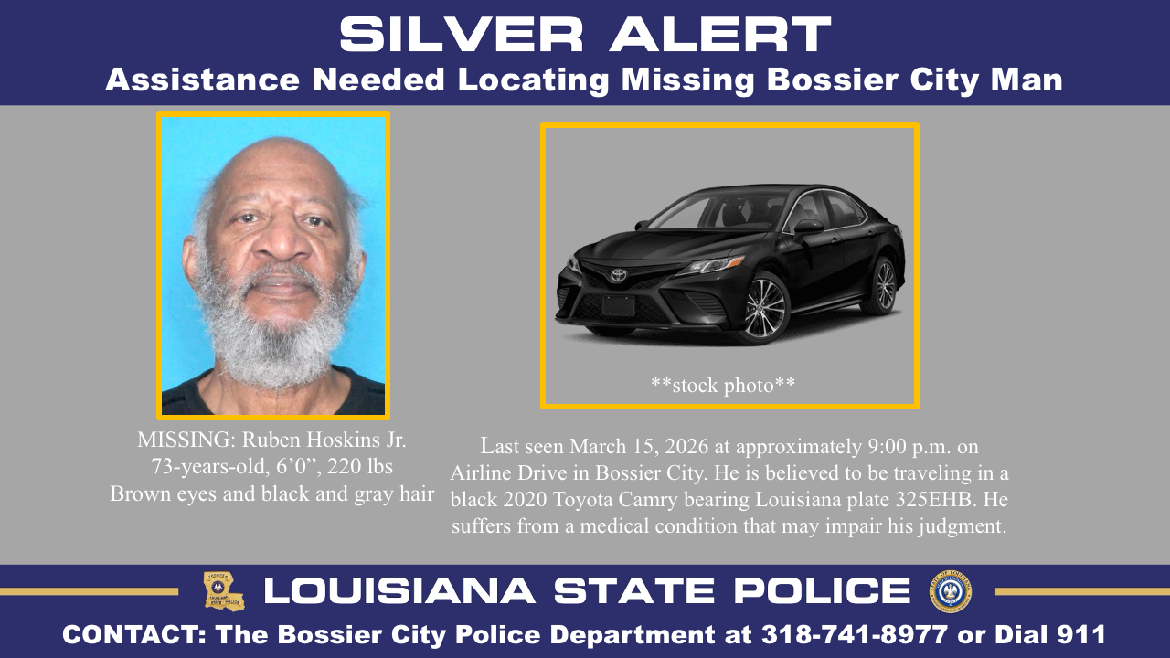 Bossier City – Louisiana State Police has issued a Silver Alert on behalf of the Bossier City Police Department for 73-year-old Ruben Hoskins Jr. He was last seen on Sunday, March 15, 2026, at approximately 9:00 p.m. at 2579 Airline Drive in Bossier City. LSP received the request to issue the alert at approximately 9:31 p.m. this evening.