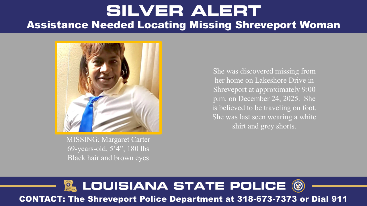 Update - The Silver Alert for 69-year-old Margaret Lias Carter has been canceled. She has been located and is safe. Please refer all inquiries about this case to the Shreveport Police Department. Thank you for the assistance.