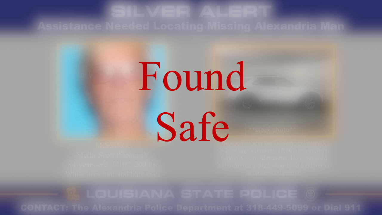 Rapides Parish – The Louisiana State Police has issued a Silver Alert on behalf of the Alexandria Police Department for 84-year-old Meritt Scott Pilcher IV. He was last seen on Tuesday, February 3, 2026, at approximately 12:00 p.m. at 1587 North Bolton Avenue in Alexandria. LSP received the request to issue the alert at approximately 12:38 p.m. on February 5, 2026.