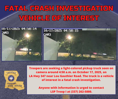 Troopers continue to investigate the fatal crash that occurred on October 17, 2025, around 5:00 a.m., on Louisiana Highway 347 near Lou Gauthier Road. Through the ongoing investigation, Troopers have identified a light-colored pickup truck as a vehicle of interest that was in the area at the time of the crash. Additionally, Troopers are still working to identify the 18-wheeler involved.